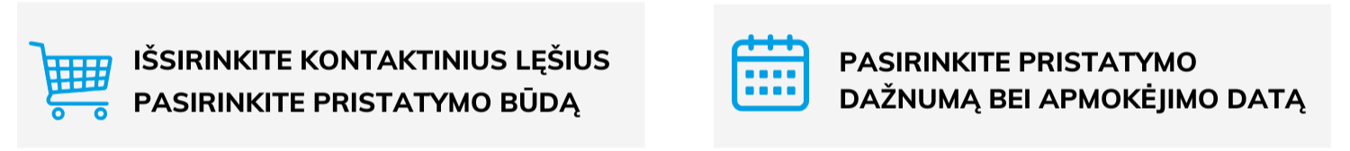 Išsirinkite kontaktinius lęšius, kuriuos norite prenumeruoti, įsidėkite juos į pirkinių krepšelį bei pasirinkite Jums patogų pristatymo būdą. Pasirinkite kontaktinių lęšių pristatymo dažnumą: kas mėnesį, pusę metų ar pusmetį. Pasirinkite apmokėjimo datą bei prenumeratos terminą (6mėn., 12mėn. arba neribotai).